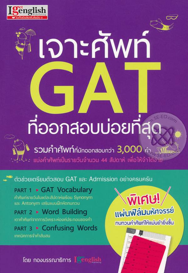เนื้อหาย่อ : คู่มือในการเตรียมตัวสอบ GAT และ Admission อย่างครบครัน โดยแบ่งเป็น 3 ส่วนด้วยกันคือ ส่วนแรกเป็นคำศัพท์ที่จัดรูปแบบเป็นสัปดาห์ กว่า 3,000 คำ แต่ละสัปดาห์ประกอบด้วยคำศัพท์ 70 คำ ย่อยเป็นวันละ 10 คำ แต่ละคำศัพท์จะเน้นที่ความหมายสำคัญ สอดแทรกคำที่มีความหมายเหมือนและความหมายต่าง รวมทั้งแบบฝึกหัดเสริมรายสัปดาห์ ส่วนที่สองคือวิธีการเดาคำศัพท์จากการวิเคราะห์องค์ประกอบของคำ และส่วนสุดท้ายคือเทคนิคการจำคำสับสน พิเศษ! แผ่นฟิล์มมหัศจรรย์ ทบทวนคำศัพท์ให้แม่นยำยิ่งขึ้น